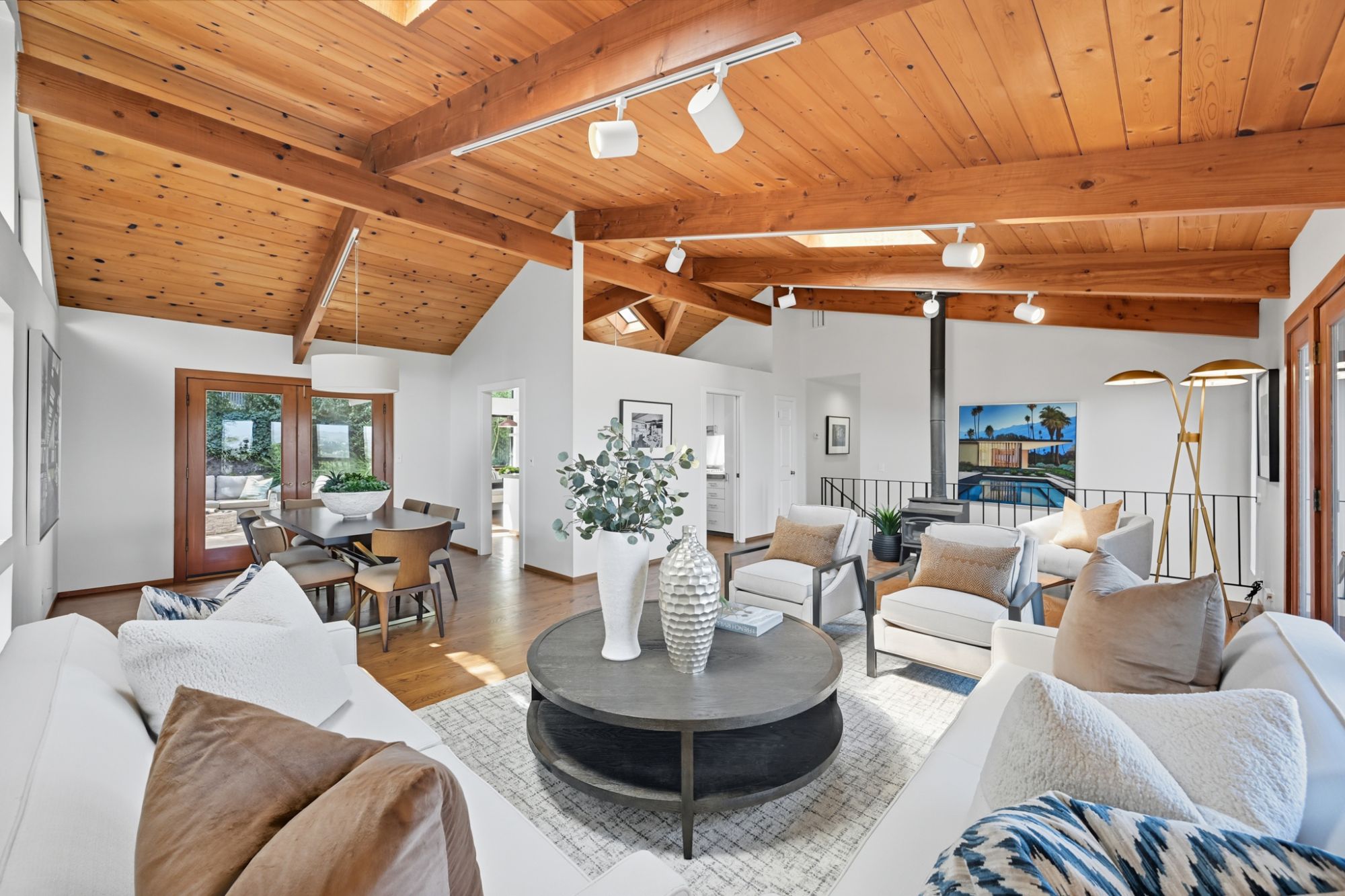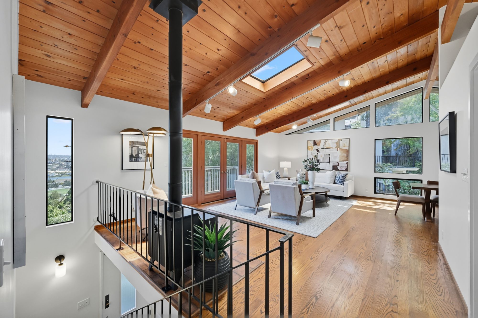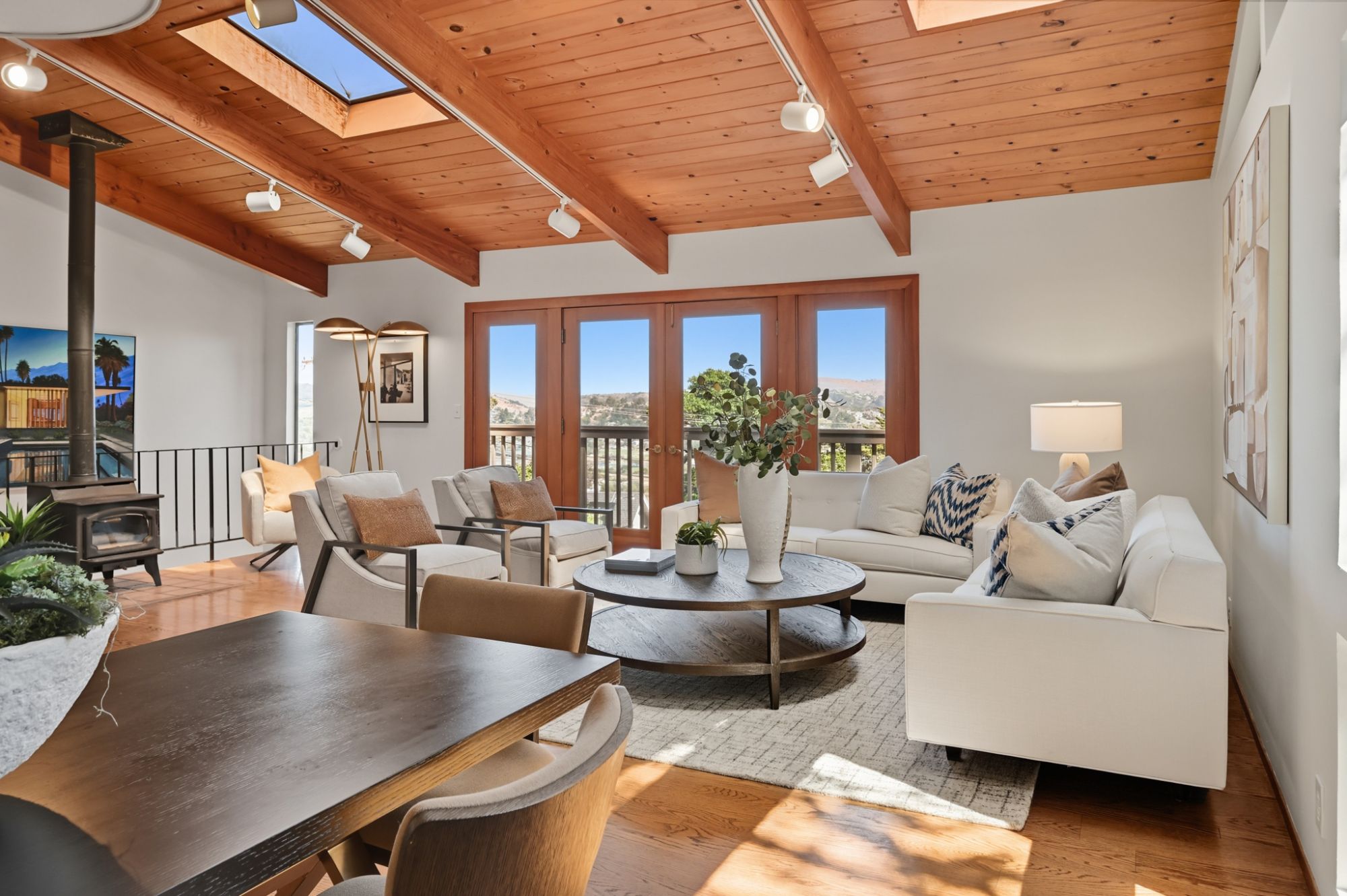 living room, anchored by a wood-burning stove, is bathed in abundant natural