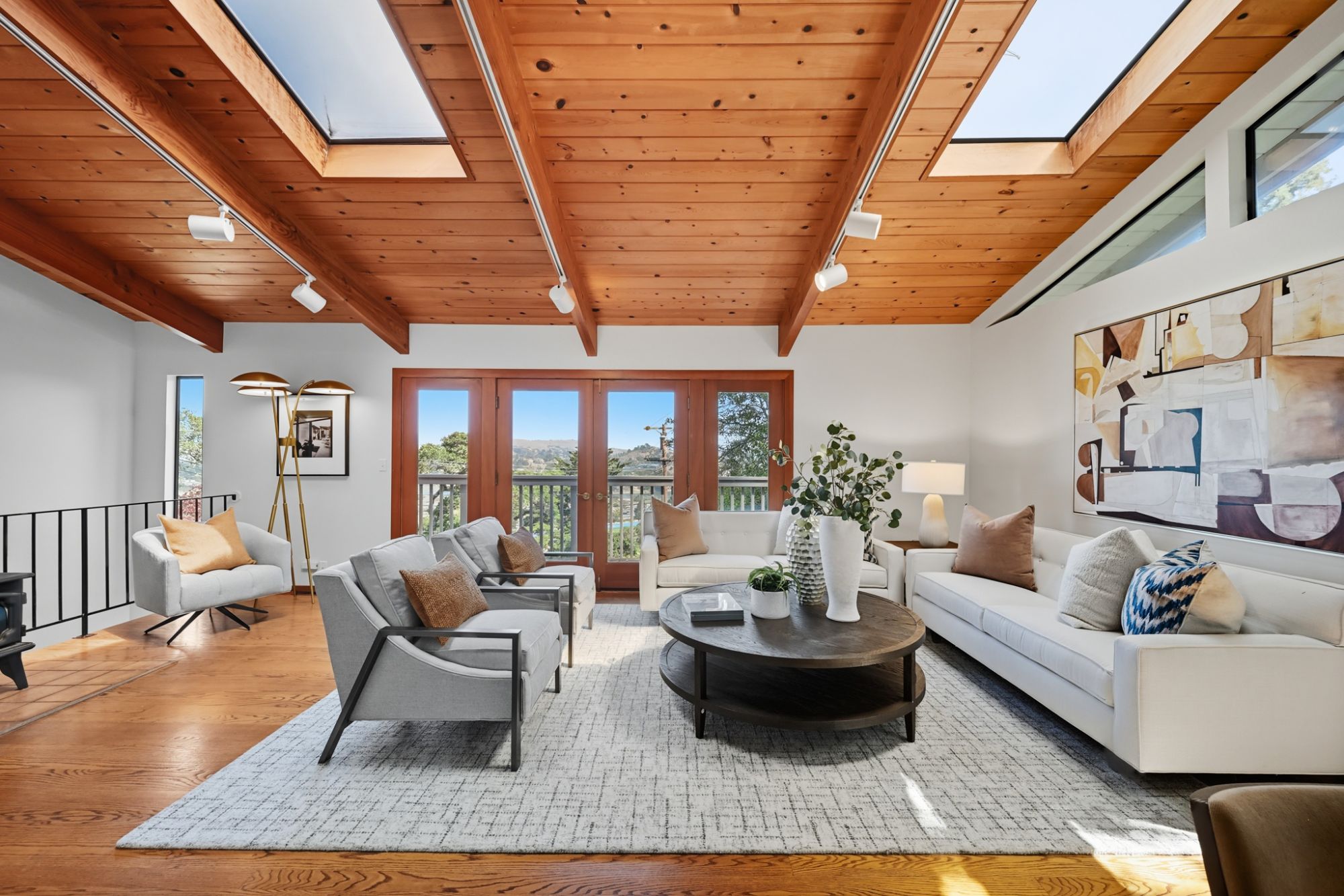 living room, anchored by a wood-burning stove, is bathed in abundant natural